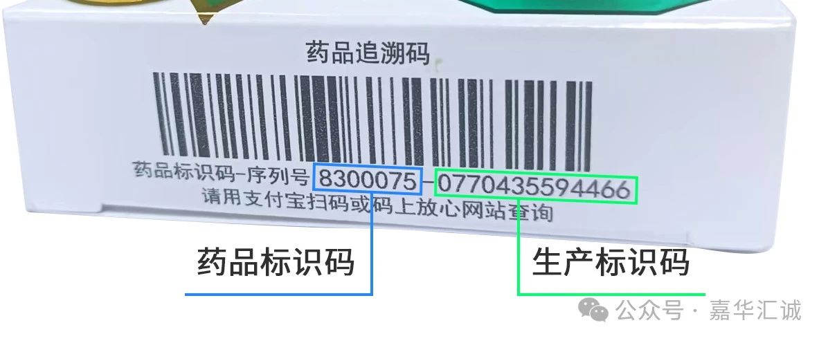 其中,符合第一项要求的药品追溯码示例如下,其代码长度为20个字符,前7位代表药品标识码,常见于药品包装之上。